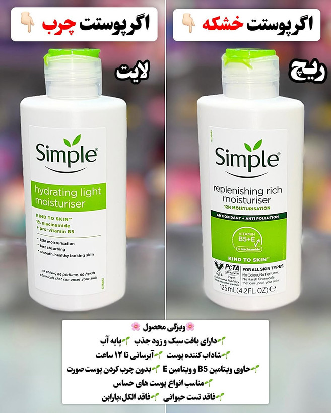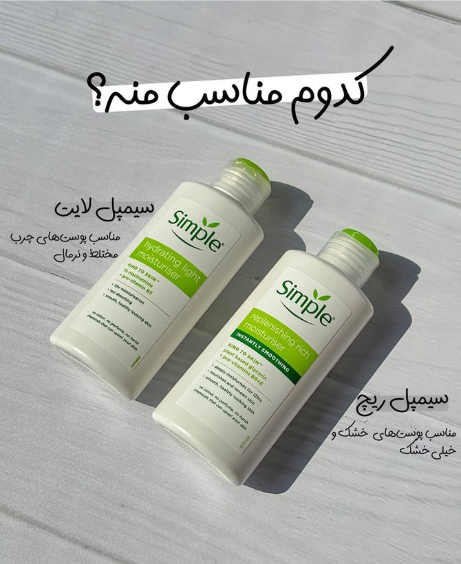 آبرسان سیمپل ساخت انگلستان و یکی از پر فروش ترین مرطوب کننده های خارجی میباشد. آبرسان لایت سیمپل علاوه بر تغذیه، تقویت و انرژی بخشی به پوست، رطوبت را تا 24 ساعت درون پوست حفظ کرده و از خشکی پوست جلوگیری میکند. بافت این محصول بر پایه آب، سبک و زود جذب بوده و بعد از استفاده احساس چربی و سنگینی روی پوست ایجاد نمیکند. هم چنین غیر کومدون زا است و منافذ پوست را مسدود نمیکند؛ در نتیجه باعث تشکیل جوش روی صورت نمیشود. بعد از استفاده از مرطوب کننده لایت سیمپل، پوست صورت نرم، لطیف و شاداب میشود.