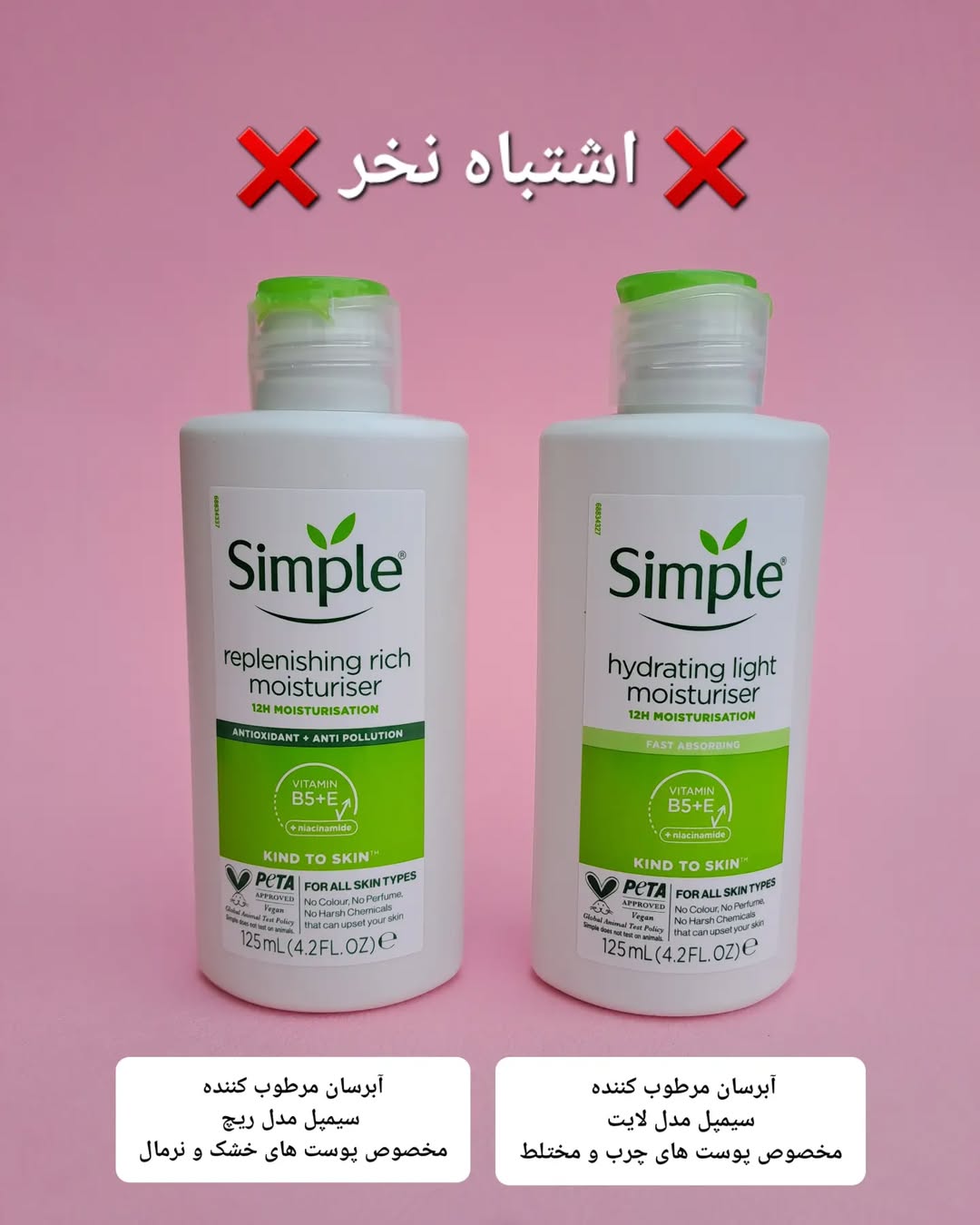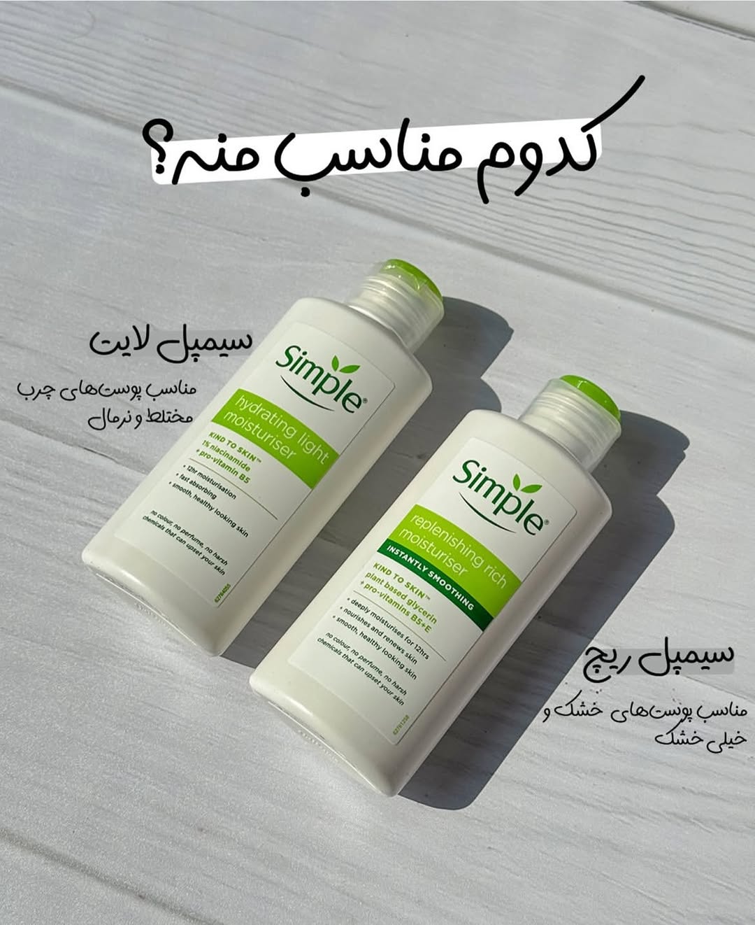 آبرسان سیمپل ساخت انگلستان و یکی از پر فروش ترین مرطوب کننده های خارجی میباشد. آبرسان لایت سیمپل علاوه بر تغذیه، تقویت و انرژی بخشی به پوست، رطوبت را تا 24 ساعت درون پوست حفظ کرده و از خشکی پوست جلوگیری میکند. بافت این محصول بر پایه آب، سبک و زود جذب بوده و بعد از استفاده احساس چربی و سنگینی روی پوست ایجاد نمیکند. هم چنین غیر کومدون زا است و منافذ پوست را مسدود نمیکند؛ در نتیجه باعث تشکیل جوش روی صورت نمیشود. بعد از استفاده از مرطوب کننده لایت سیمپل، پوست صورت نرم، لطیف و شاداب میشود.